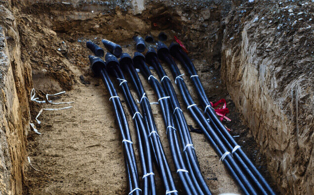 Expert installation of mains cabling from network pillars to metre boxes with correct segregation, depth, and protection in accordance with distributor regulations.